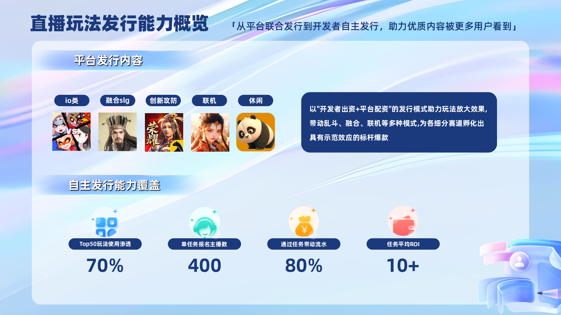 自直播玩法业务启动以来,我们有幸与众多富有创造力的开发者携手,共同见证了这一新兴内容生态的蓬勃发展。从最初的模式探索,到如今百花齐放,平台已成功发行多个标杆项目,为各垂类赛道树立了成功范式,推动行业规模迈上新的台阶。过去一年,我们将发行中沉淀的宝贵经验与行之有效的方法,逐步固化为平台能力,也同步推出了多项激励政策,后续期待各位借助任务金,更灵活地自主发行。