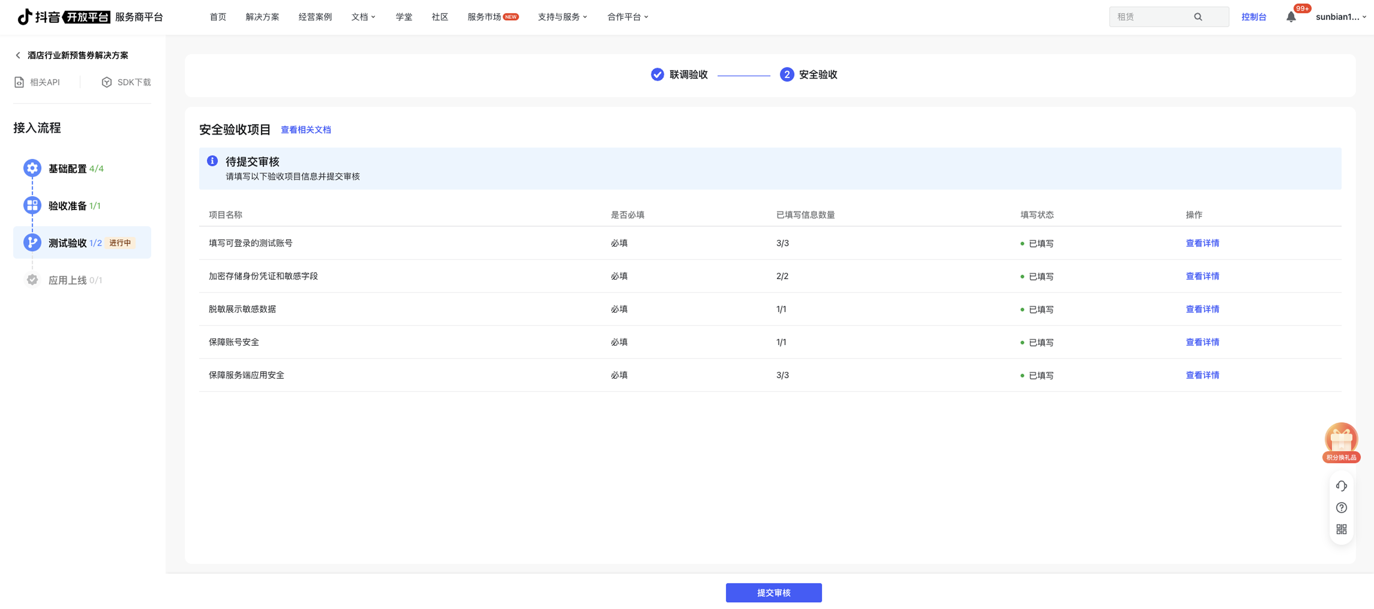 第三步:完成所有安全验收项目的信息填写后,点击页面下方的提交审核按钮进行提交,等待平台审核通过后即可完成安全验收。