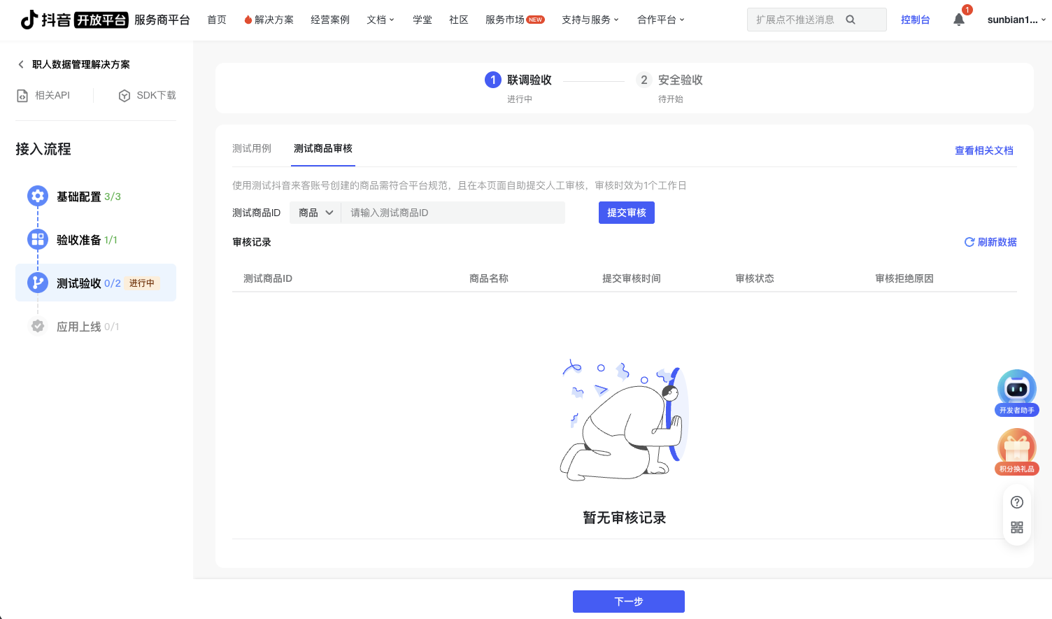 第一步:在解决方案接入详情页导航栏选中测试验收-联调验收,切换到测试商品审核Tab页。在页面上方提交审核: