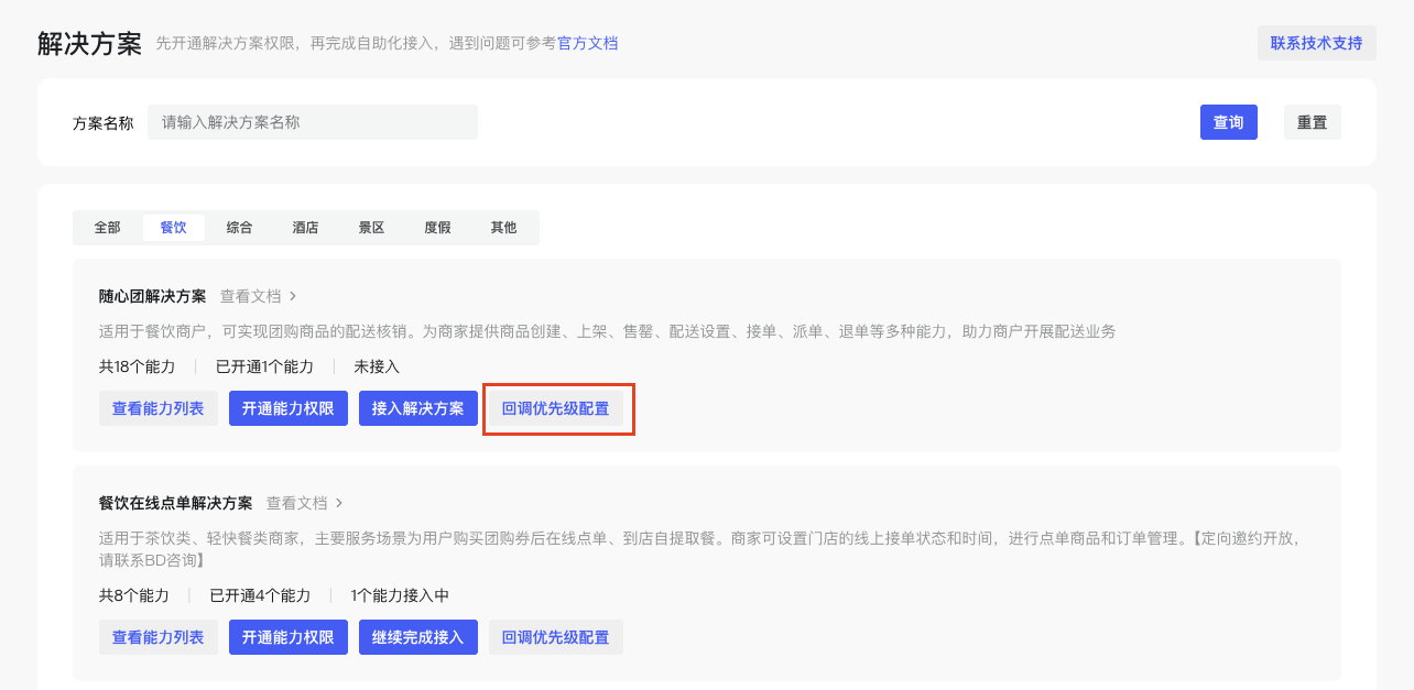 第三步:在应用详情页的左侧导航栏选中解决方案,找到随心团解决方案,点击「回调优先级配置」按钮打开弹窗。