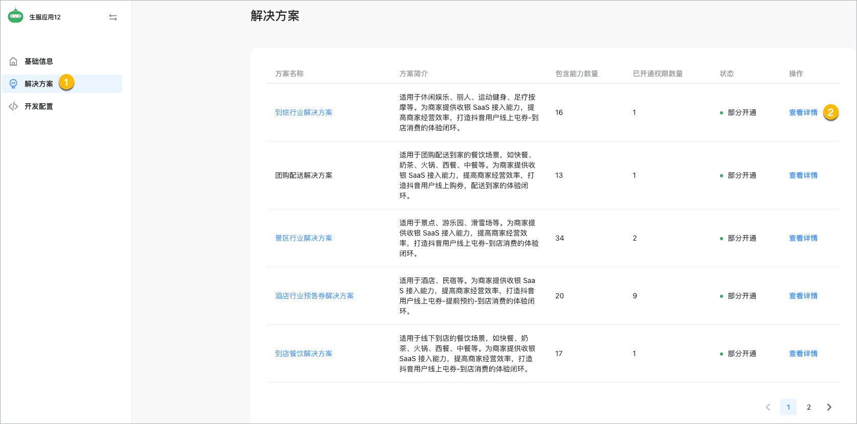 3.在应用左侧导航栏点击「解决方案」,在「解决方案」页面【景区行业解决方案】的「操作」列点击「申请开通」。