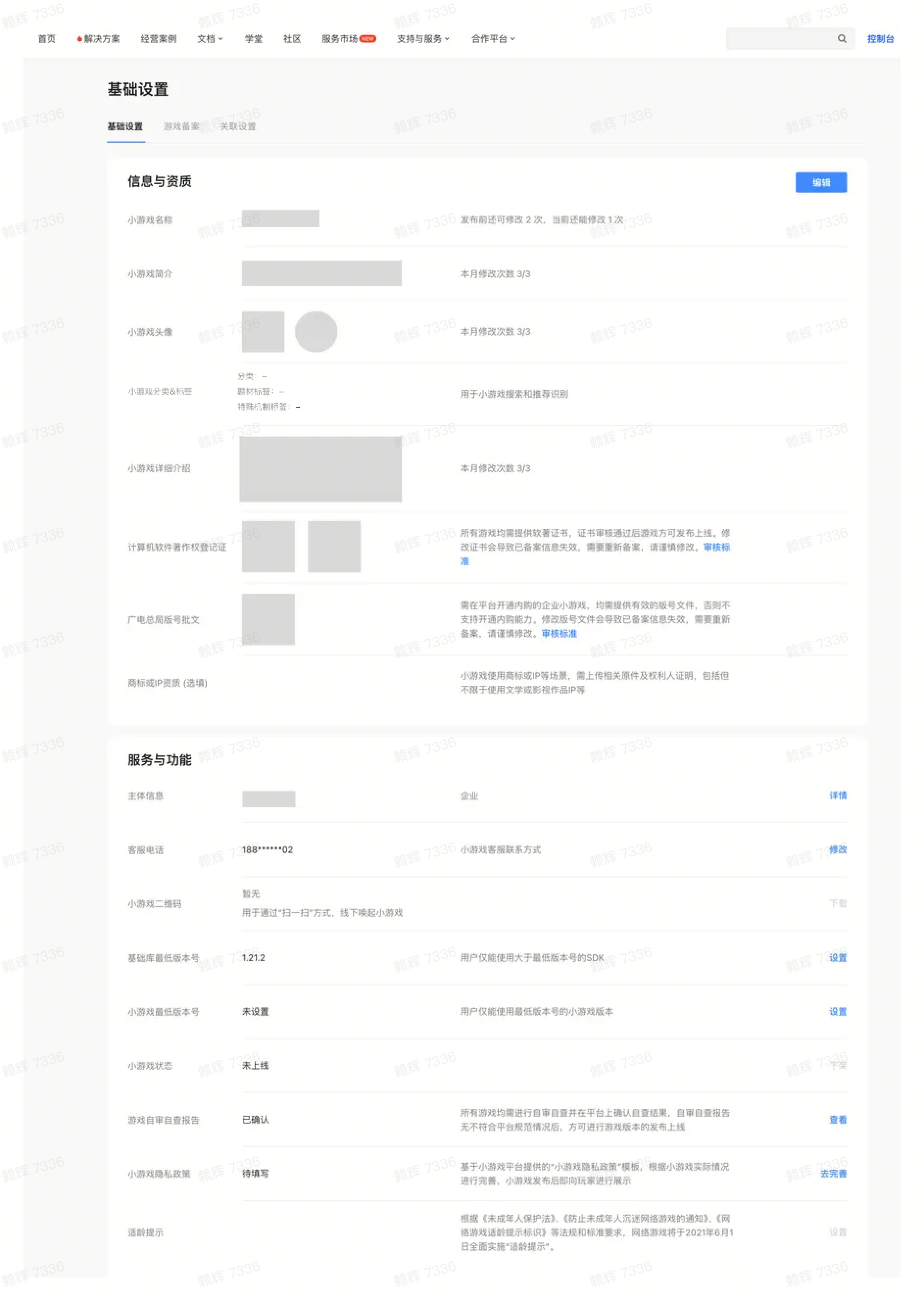 小游戏创建后,请及时补充小游戏上线所需的名称、图标、简介、资质等信息。