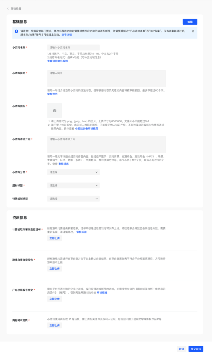 自 2024 年 8 月 6 日起,为了提升小游戏入驻效率和信息一致性,小游戏基础信息将统一进行审核,请在创建小游戏后及时完善基础信息。